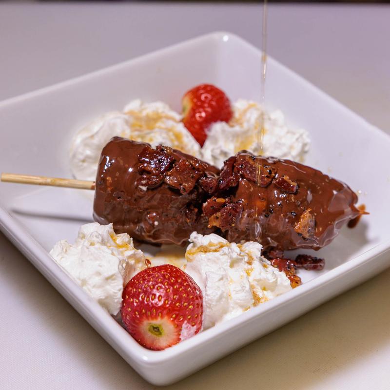 Hand dipped corn dog butterflied and loaded with mac, bacon bits and chives.