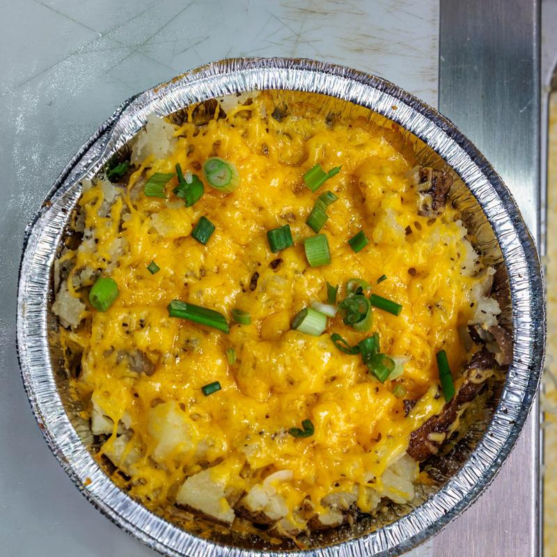 Fried potatoes topped with scrambled egg, cheese, millionaires bacon, gravy and green onion.
