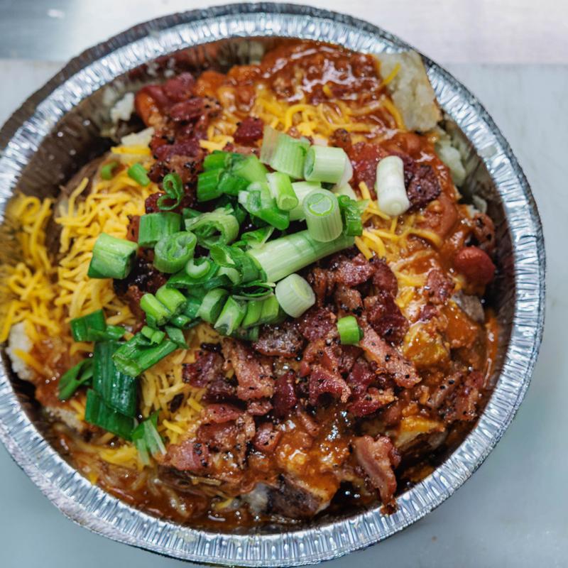 Loaded baked potato with mac chili, cheese and chive.